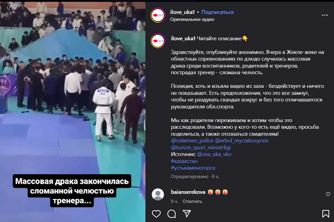 В управлении физической культуры и спорта Восточно-Казахстанской области подтвердили факт происшествия и заявили, что в настоящее время обстоятельства инцидента выясняются совместно с полицией.