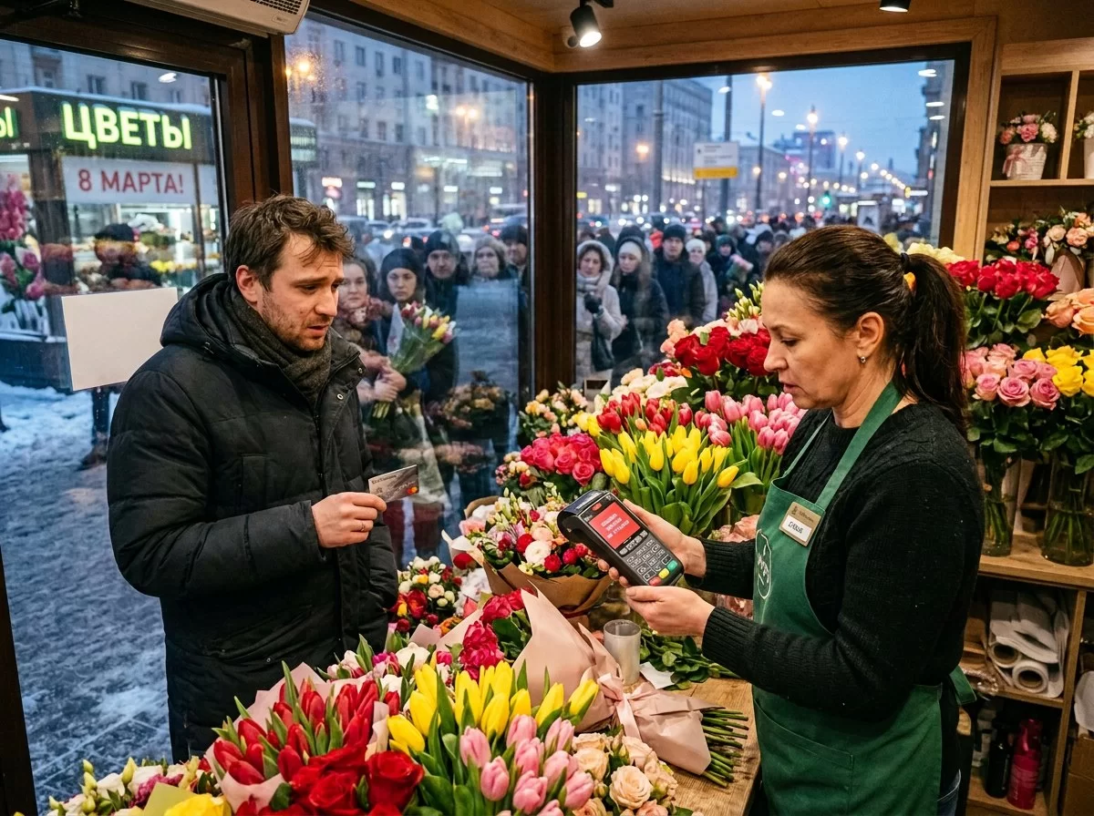 Накануне главного женского праздника страны столица внезапно оказалась в цифровой тишине. Люди шли за букетами — и разворачивались у прилавка. Заказывали столики в ресторанах — и отменяли заказы. Не потому что денег нет. Просто карту было некуда приложить.